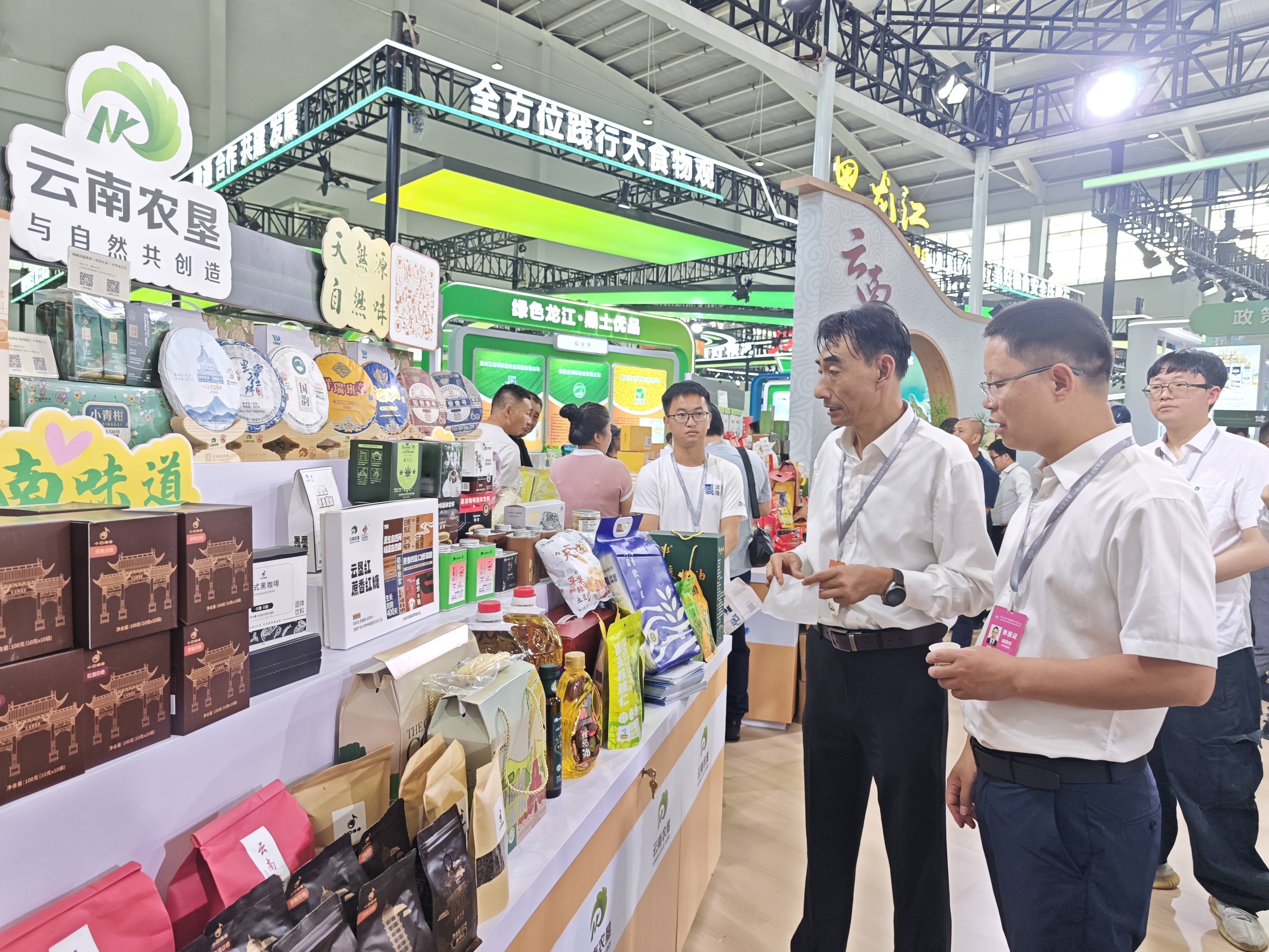 在云南优质粮油特装展馆,产自大理苍山脚下、洱海之畔高原“黑土地”,采用绿色有机种植模式的“洱海留香”软香米,以其独特的品质受到消费者的青睐;在云南优质农产品分馆,集团旗下“云胶”枕头、“八角亭”茶叶、“云啡”咖啡、“百华谷”蜂蜜、“云垦”坚果、“天使”土豆片、“何其乐”食品、“云核”核桃油等特色产品集中亮相,以“天然源 自然味”“与自然共创造”的云南味道,向消费者和客商们展示了云南高原农产品的品质与特色。